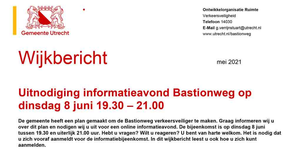 De gemeente Utrecht heeft een plan gemaakt om de Bastionweg verkeersveiliger te maken. zij wil betrokkenen informeren over dit plan en nodigen u uit voor een online informatieavond.