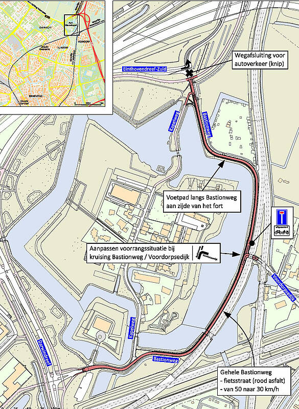 Kern van het plan is de inrichting van de Bastionweg als fietsstraat, waar de auto te gast is. Verder worden de aansluitingen op de spoorwegovergang en de Einthovendreef Zuid gewijzigd. De maximumsnelheid wordt 30km/u.