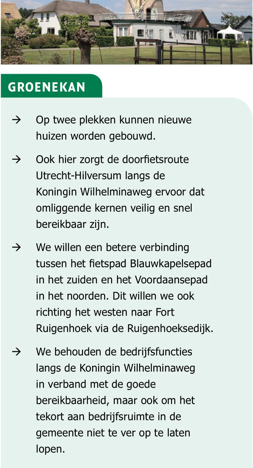 In de Omgevingsvisie wordt per deelgebied de voorgestelde koers in kernpunten uiteengezet. Hieronder ziet u de koers voor Groenekan.